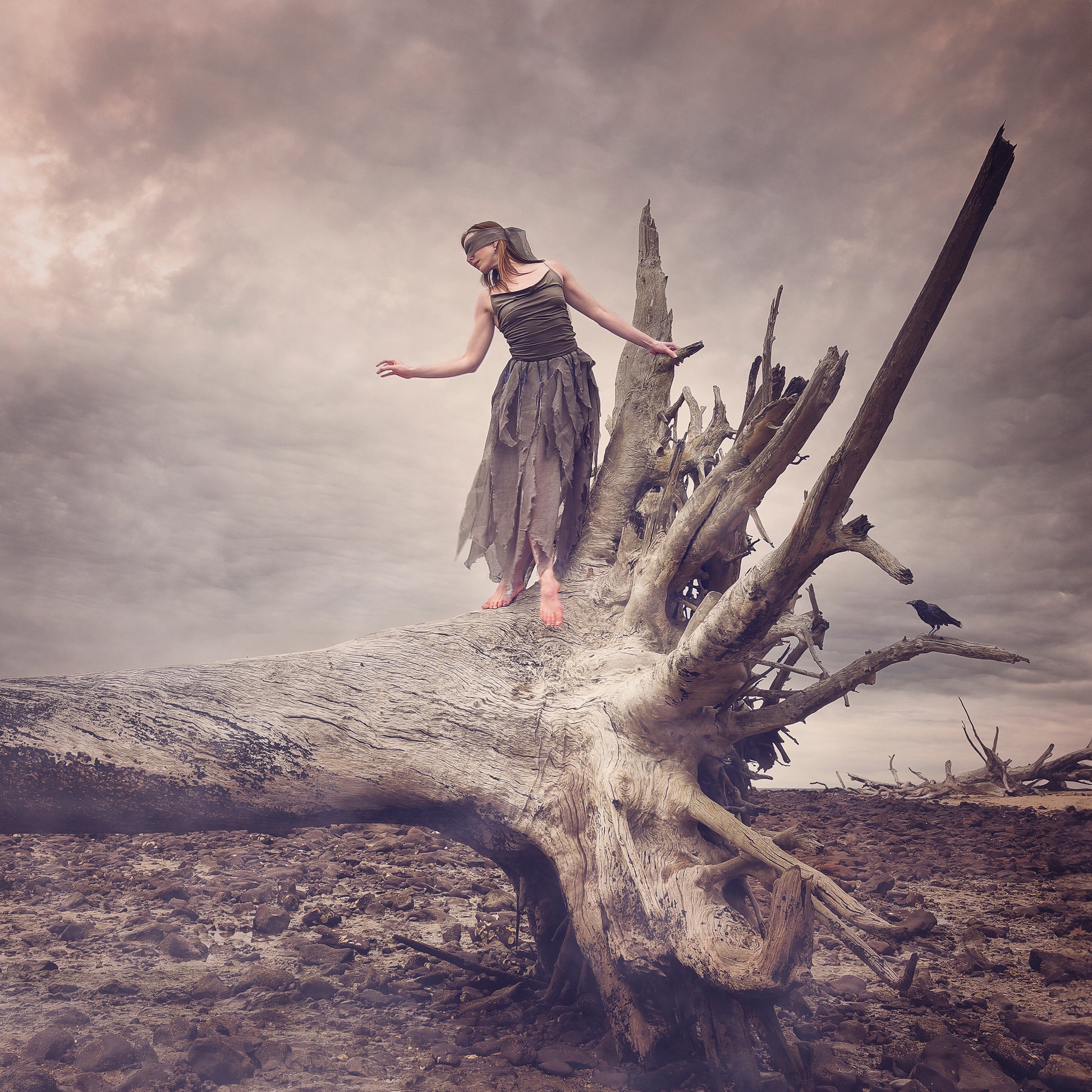 Blindfolded, she balances on fallen driftwood, embodying fragility and trust in an uncertain path.