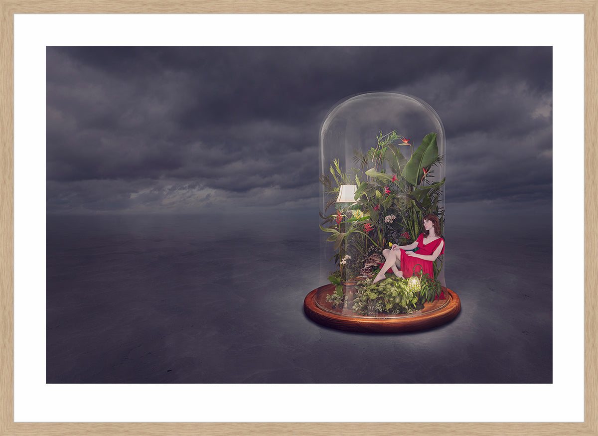 Haven contemplates the idea of retreat and protection, enclosing the subject in a fragile refuge against the storm. The glass dome creates a surreal tension between safety and isolation, while the lush interior contrasts with the stark, desolate surroundings. As with much of my work, the piece balances the ordinary with the uncanny, inviting the viewer to question what is shelter and what is confinement.