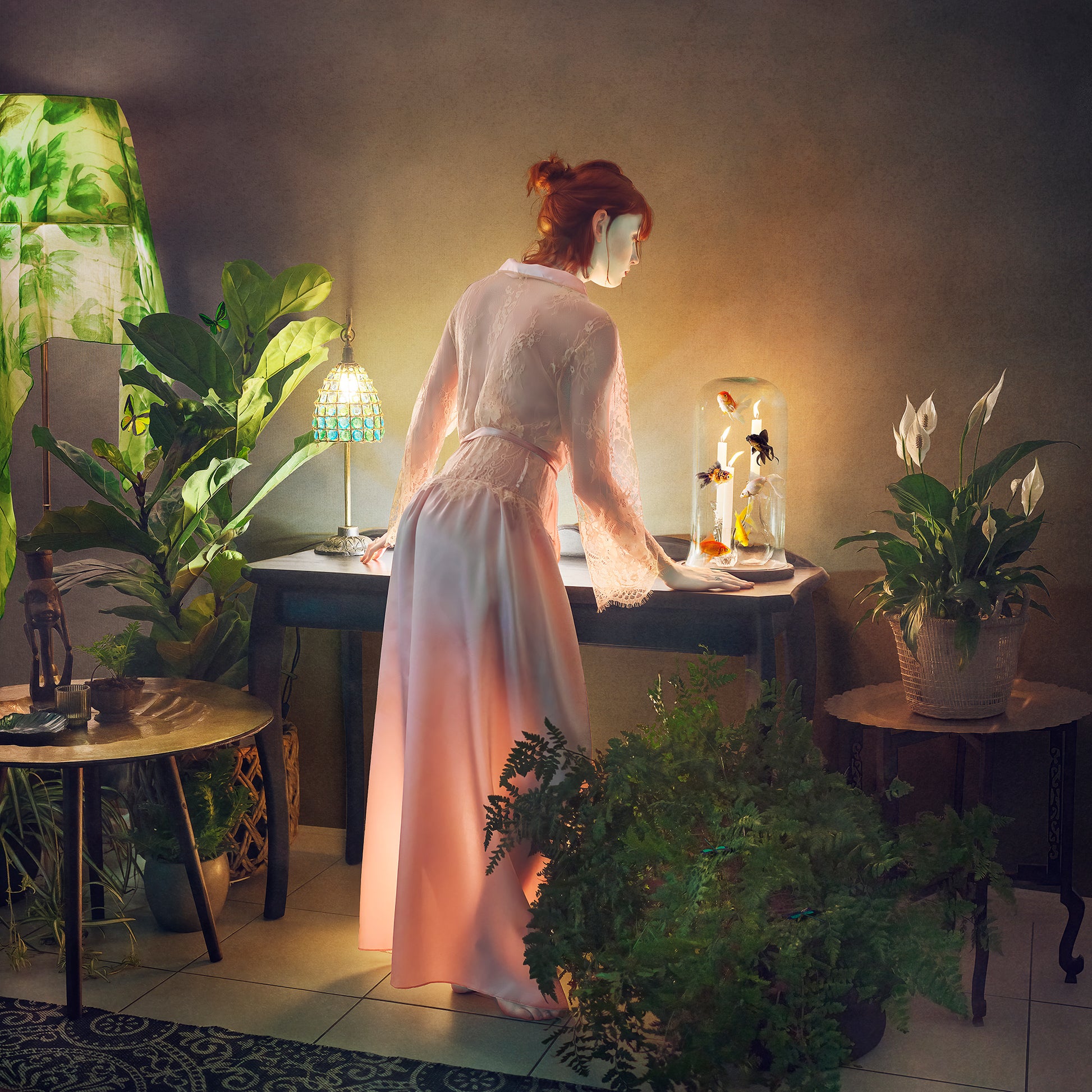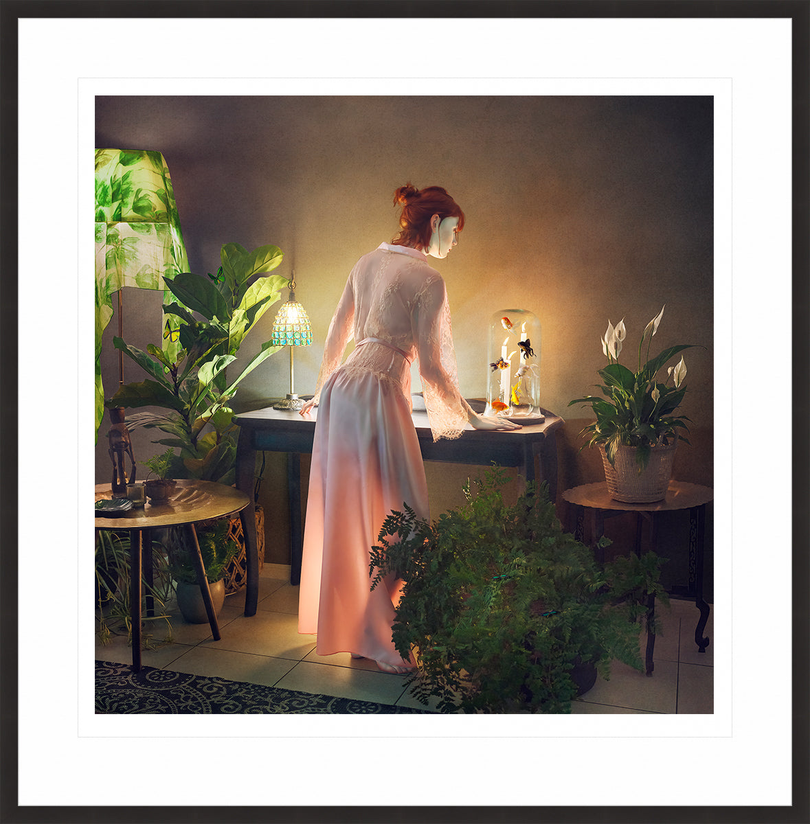 Hot Sushi explores the play of light as both subject and atmosphere, borrowing from the dramatic contrasts of Romantic painting. The translucent glow of the figure’s skin suggests both fragility and presence, while the surreal centrepiece under glass adds my signature twist of humour and unease.