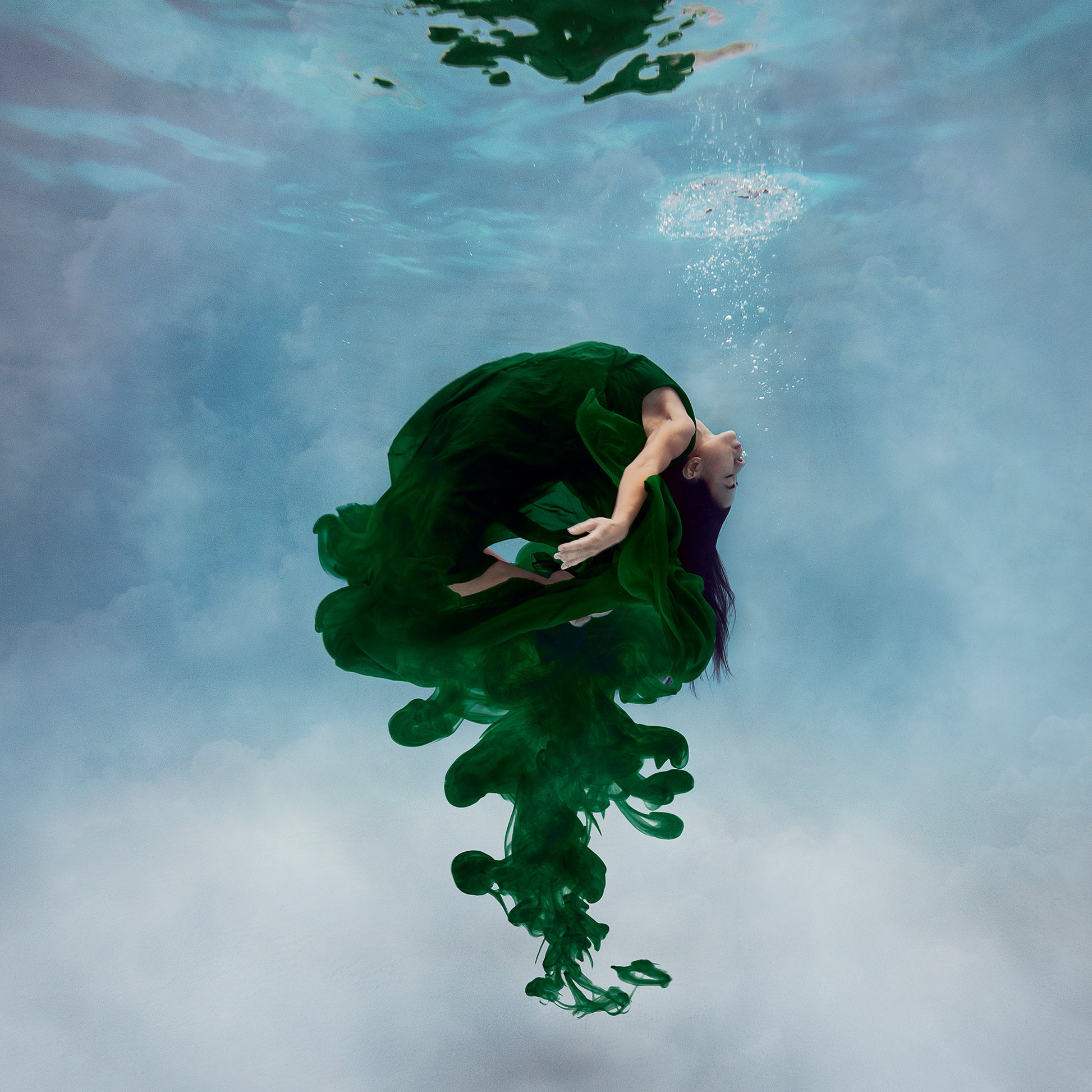 I’ve always been drawn to the calm of underwater imagery - the quiet isolation, the slowed movements and the hypnotic flow of hair and fabric that feel like flying in slow motion. Working with ink in water adds another layer of unpredictability, creating organic, one-of-a-kind forms. It felt natural to combine these elements, blending the softness of fabric with the fluidity of ink. By manipulating colour and skin tones, I aim to heighten that sense of vulnerability and calm, offering moments of grace in a turbulent world.