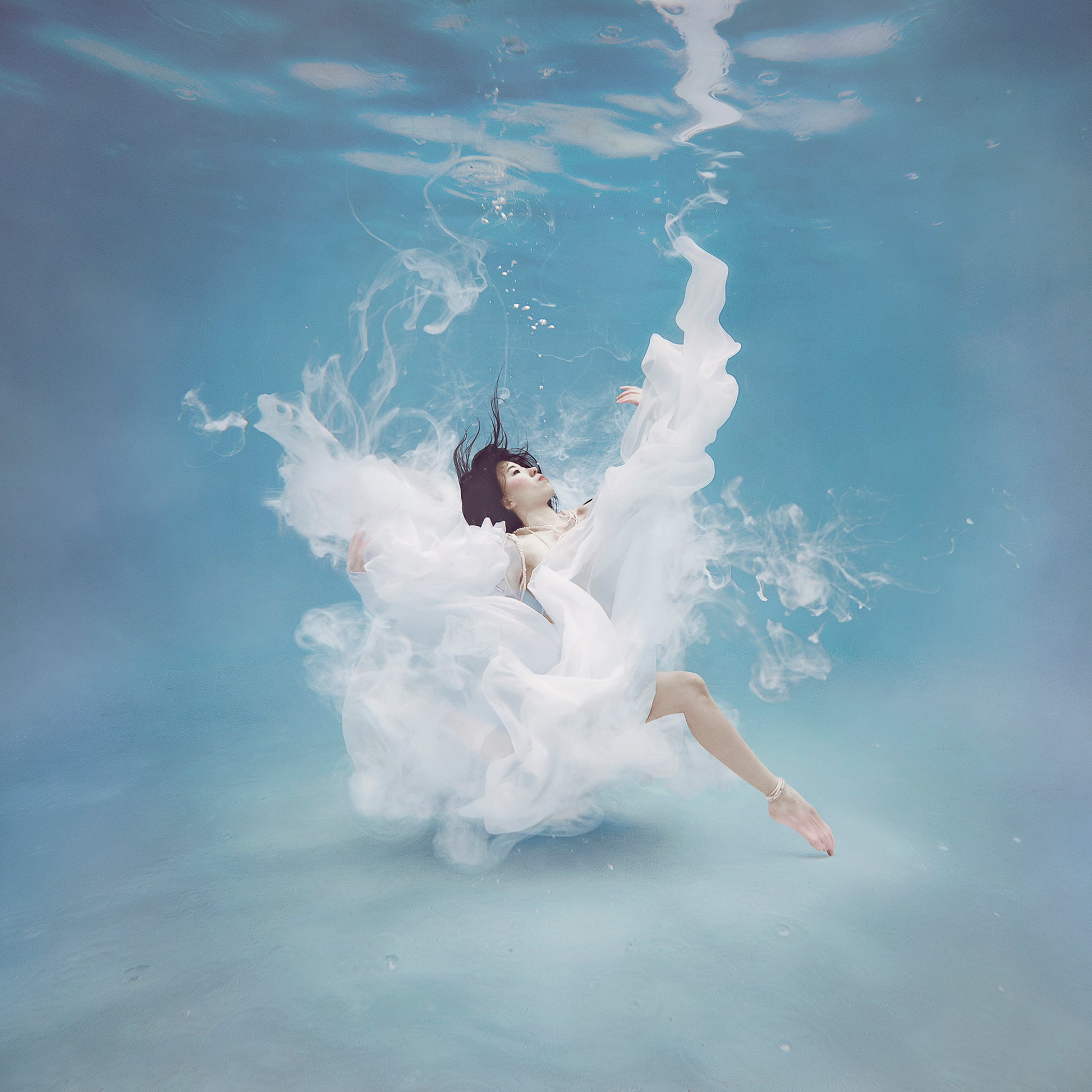 I’ve always been drawn to the calm of underwater imagery - the quiet isolation, the slowed movements and the hypnotic flow of hair and fabric that feel like flying in slow motion. Working with ink in water adds another layer of unpredictability, creating organic, one-of-a-kind forms. It felt natural to combine these elements, blending the softness of fabric with the fluidity of ink. By manipulating colour and skin tones, I aim to heighten that sense of vulnerability and calm, offering moments of grace in a turbulent world.